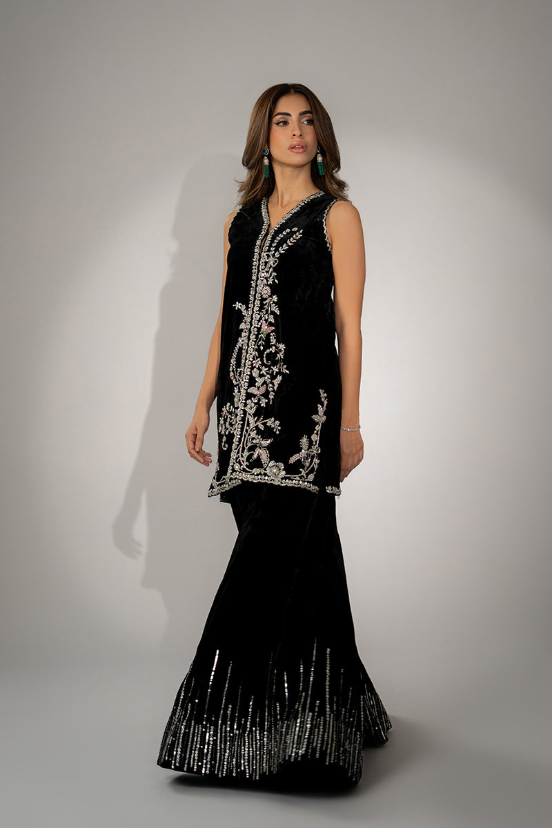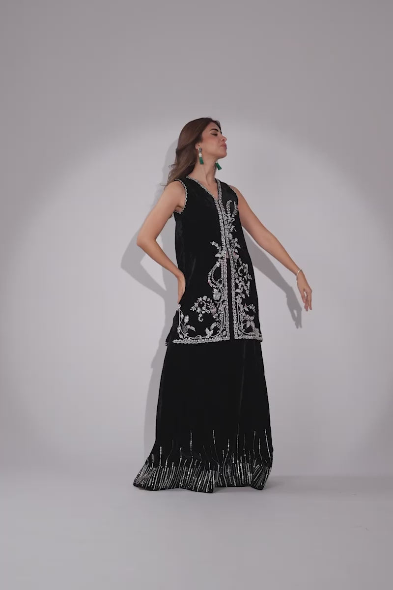 Step into unparalleled luxury with this opulent black ensemble, a true embodiment of redefined elegance. The sleeveless velvet jacket is meticulously hand-embellished with intricate silver floral and vine work that richly details the neckline and descends gracefully toward the hem. Paired with a matching, floor-sweeping sharara featuring a heavily sequined border, this exquisite piece ensures you make a commanding statement at any grand occasion.