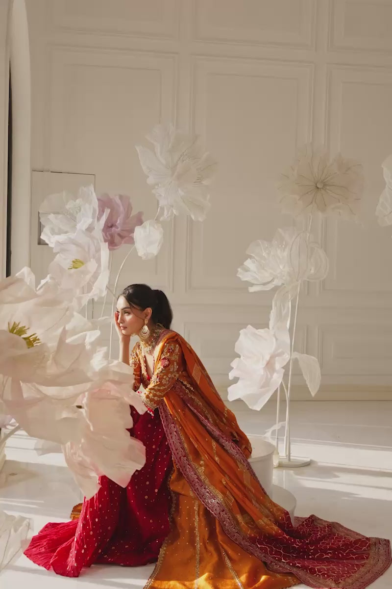 Illuminate your event in this vibrant orange pishwas from Mina Hasan’s Dholki Collection, which perfectly captures a festive, warm glow. The opulent full-length dress features intricate gold zardozi and sequin work on the bodice and a flattering open front, revealing a peek of the rich, ruby-red layered skirt underneath. Complemented by a contrasting red-bordered dupatta, this outfit is a stunning choice for a mehndi or dholki celebration.