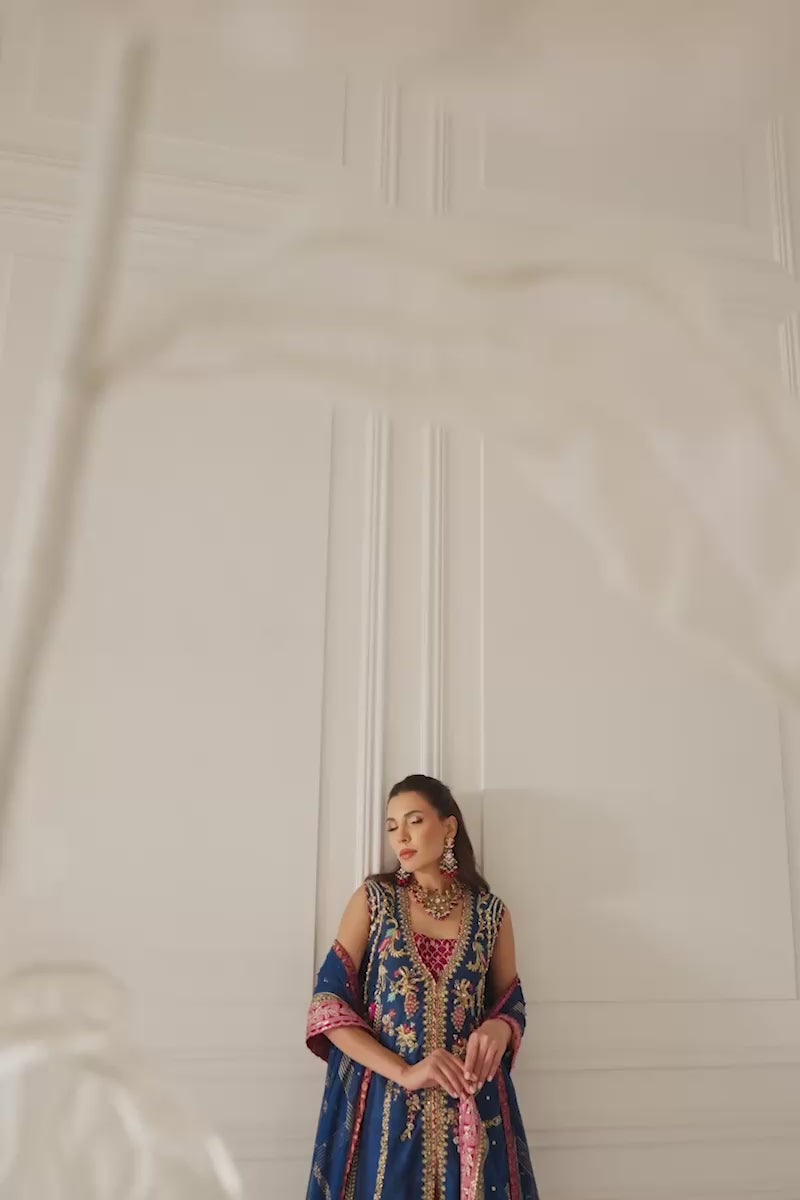 This captivating design from Mina Hasan’s Dholki Collection combines a luxurious royal blue, sleeveless open jacket with a vibrant fuchsia pink underlayer for a striking contrast. The long jacket is richly embroidered with intricate gold zari and tilla work, perfectly framing the shimmering texture of the pink gharara underneath. This majestic ensemble is a contemporary take on classic festive wear, designed to make a dramatic and elegant statement.