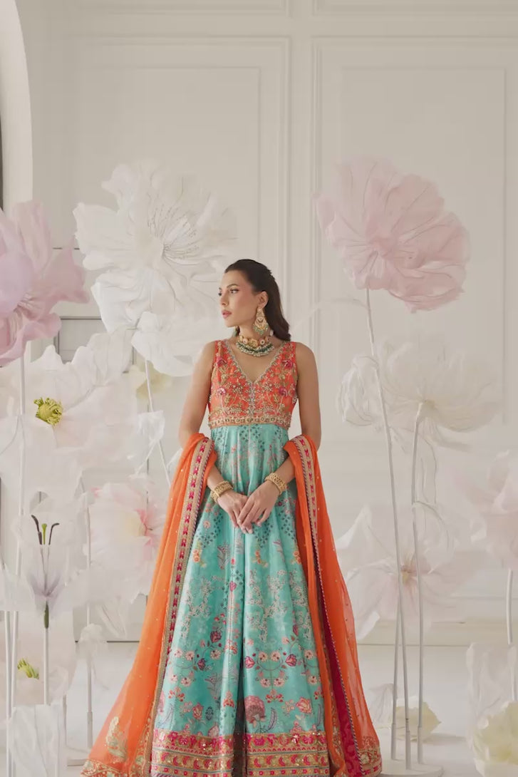 This vibrant pishwas ensemble from the Dholki Collection is a stunning masterpiece of contrasting color and artistry. The full-flared teal blue lehenga and contrasting body are richly detailed with multi-colored floral embroidery and shimmering embellishments that evoke an enchanted garden. It is dramatically contrasted with a brilliant tangerine orange dupatta, finished with an ornate border, making it an exquisite choice for a festive wedding occasion.