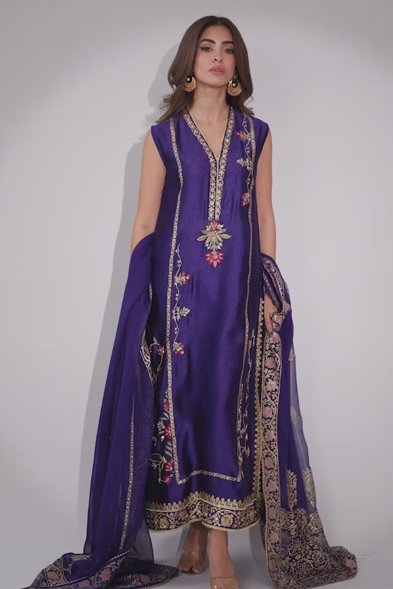 Behold the majestic allure of this vibrant royal blue sheesha silk ensemble, a luxurious piece from our Luxury Pret collection designed for maximum impact. The kurta features exquisite gold block print and zardozi work that outlines the V-neckline and side seams, beautifully framing the embroidered floral motifs in rich pinks and reds. A magnificent contrasting border featuring baroque-inspired patterns anchors the outfit, complemented by a matching dupatta to deliver redefined elegance for any grand occasion.