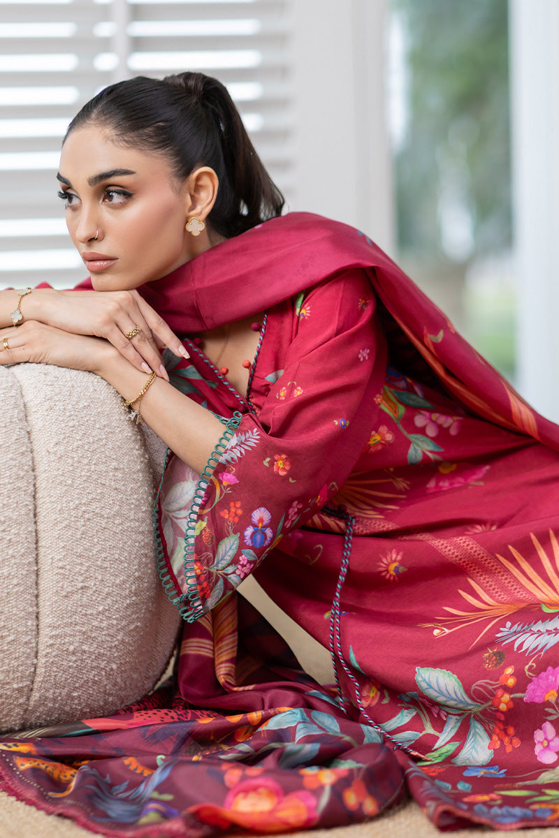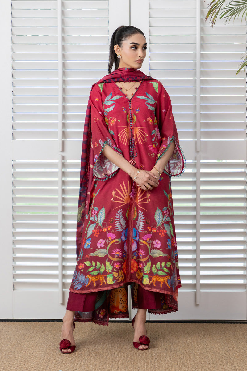 Look absolutely striking in this red Signature Print Mina Hasan kurta. Featuring bright flora and botanical patterns on the kurta and dupatta, this outfit is completed with a solid wide leg pant.