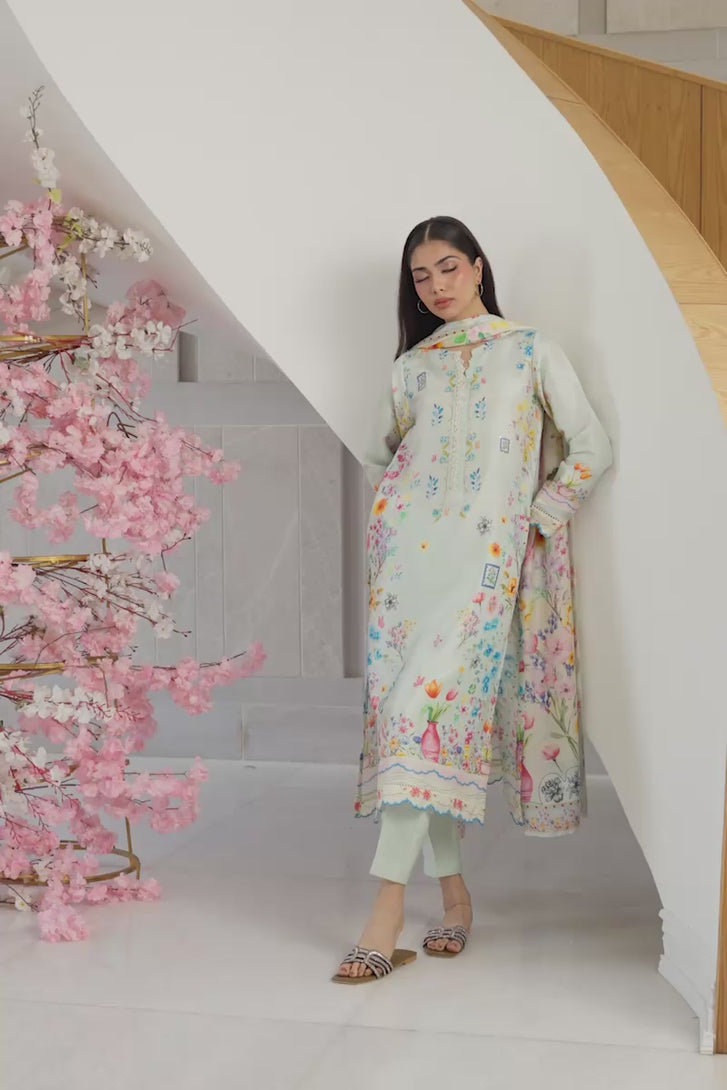 Look ever graceful in this pastel Signature Print Mina Hasan kurta. Featuring subtle floral blossoms on the kurta and the dupatta, the outfit is completed with a solid pant.