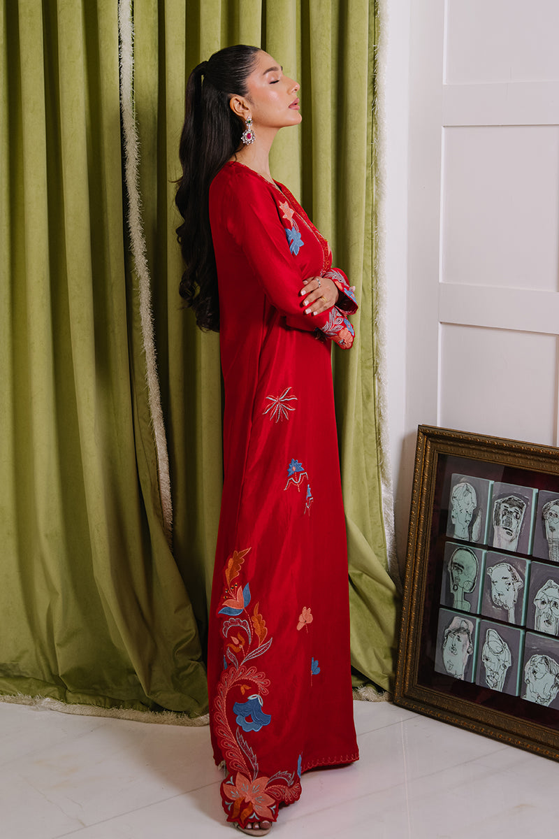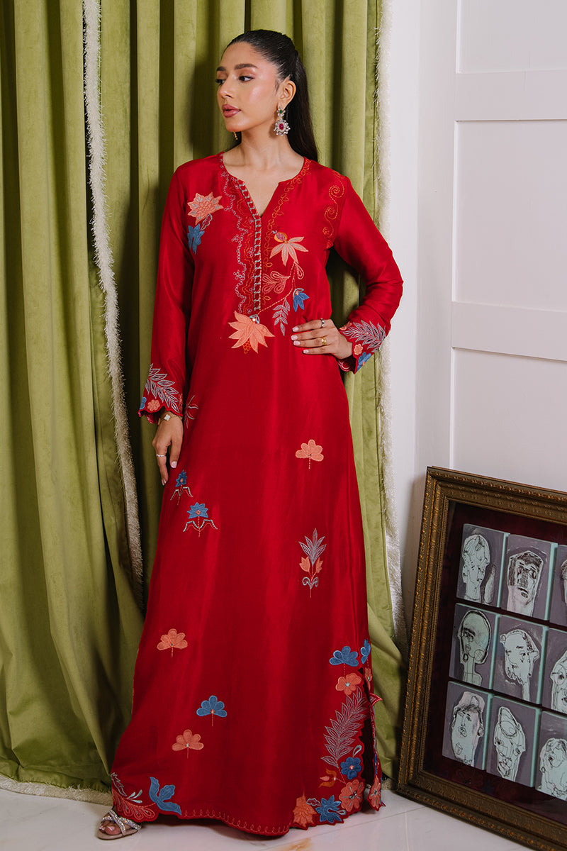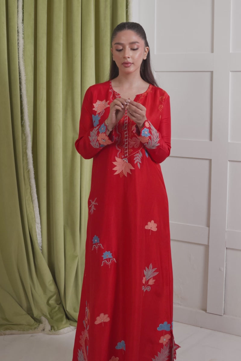 This striking kaftan in a vibrant crimson red is beautifully adorned with intricate floral and abstract embroidery in contrasting hues of blue, coral, and teal, richly detailing the neckline, sleeves, and hem. The traditional kaftan silhouette offers an exceptionally easy-to-wear and comfortable drape, flowing effortlessly for a regal, flattering look on all figures.