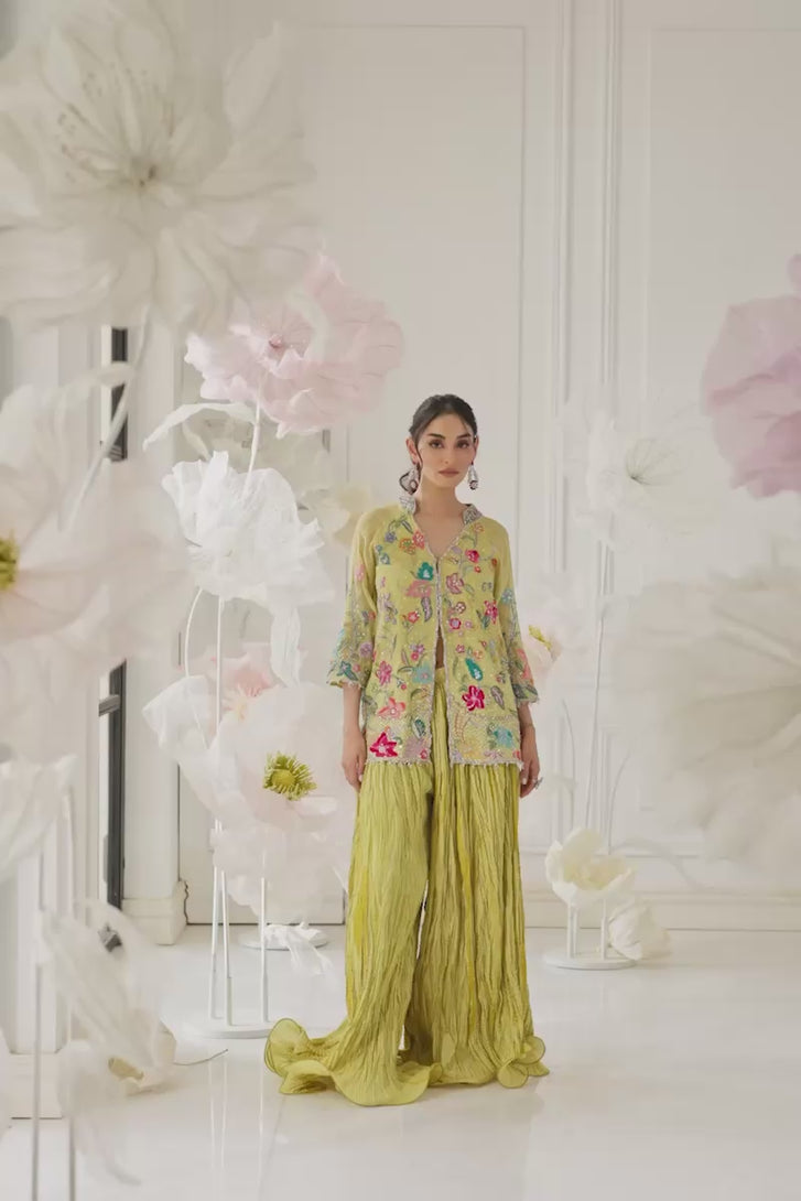 Celebrate the festive spirit with this cheerful ensemble featuring a lime-yellow short jacket beautifully covered in vibrant multicolor floral embroidery. The lively kurta is perfectly paired with a dramatically flared, crushed silk gharara in a matching shade of yellow, lending gorgeous volume and movement to the outfit. This traditional yet playful combination, rich in detail and saturated color, is an ideal choice for a Dholki or Mehndi function.