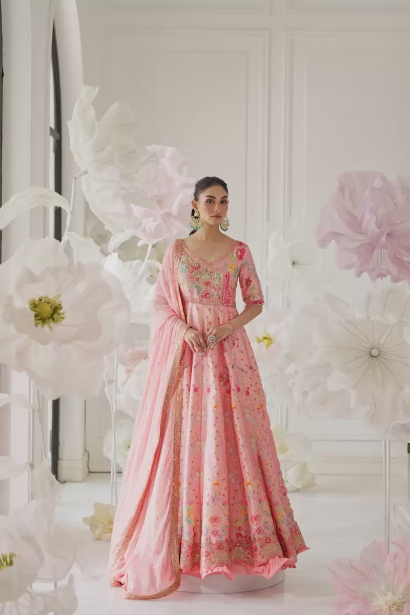 Ethereal and graceful, this salmon-pink pishwas from the Dholki Collection is an absolute vision, featuring a breathtakingly voluminous silhouette perfect for dancing the night away. The flowy kalidar is adorned with delicate, multi-color floral embroidery and sparkling embellishments that cascade from the heavily worked bodice down to the wide, decorative hem. Paired with a matching dupatta, this ensemble offers a fresh, romantic take on festive glamour.
