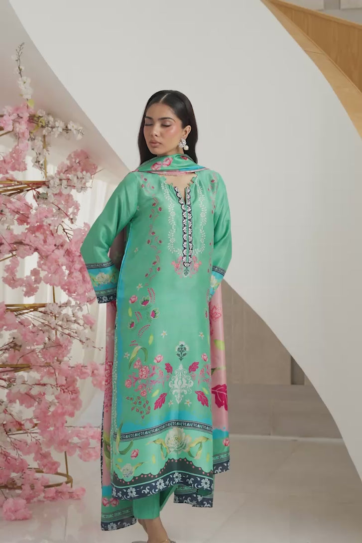 This signature teal Mina Hasan outfit is perfect for summer events! The neckline features stone embroidery, with contrasting motifs. The outfit is completed with a matching straight pant and a contrasting dupatta with teal embroidered florals.