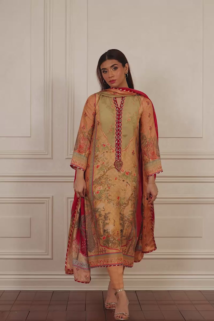 Our signature Mina Hasan digital print kurtas come back in a straight silhouettes and striking colors! Choose this beige botanical option for effortless elegance ! Comes with hand worked button details and festive lace edgings, with a contrasting dupatta.