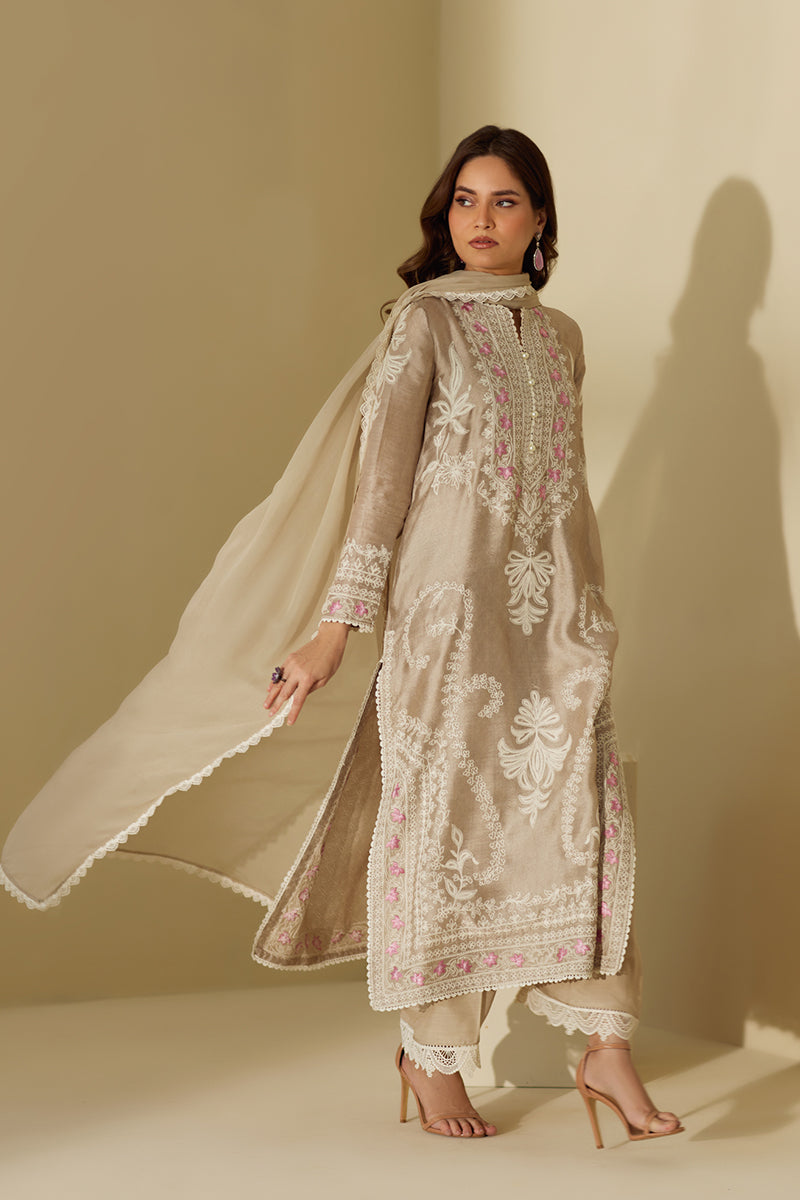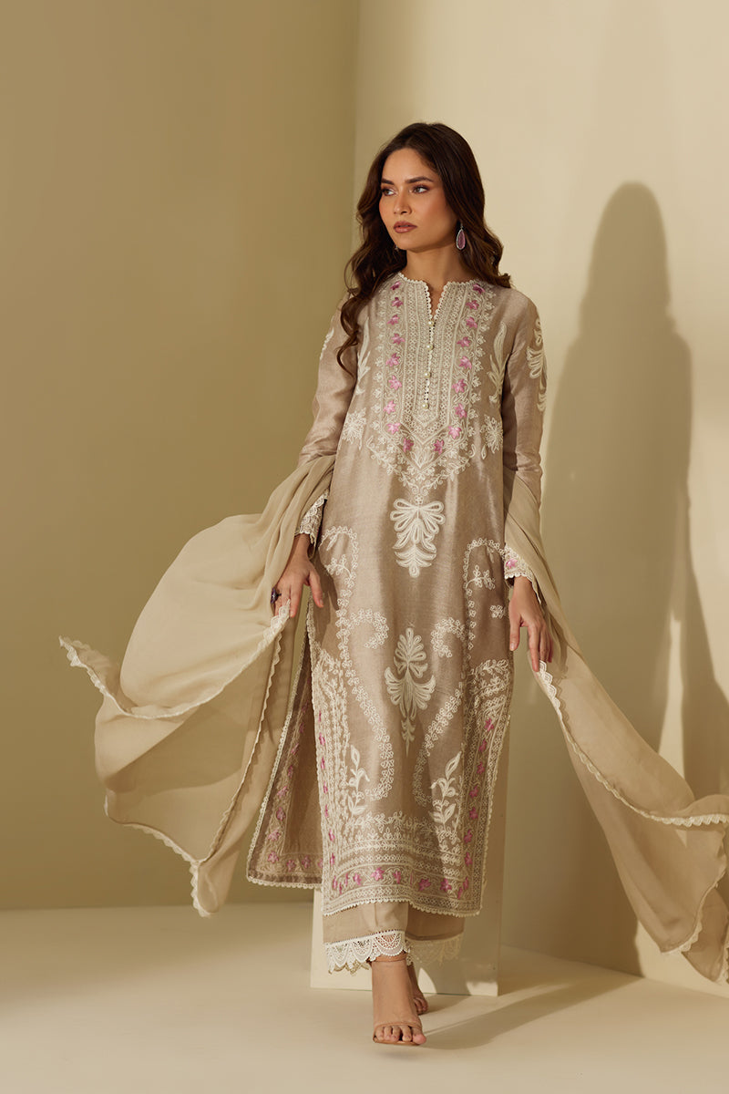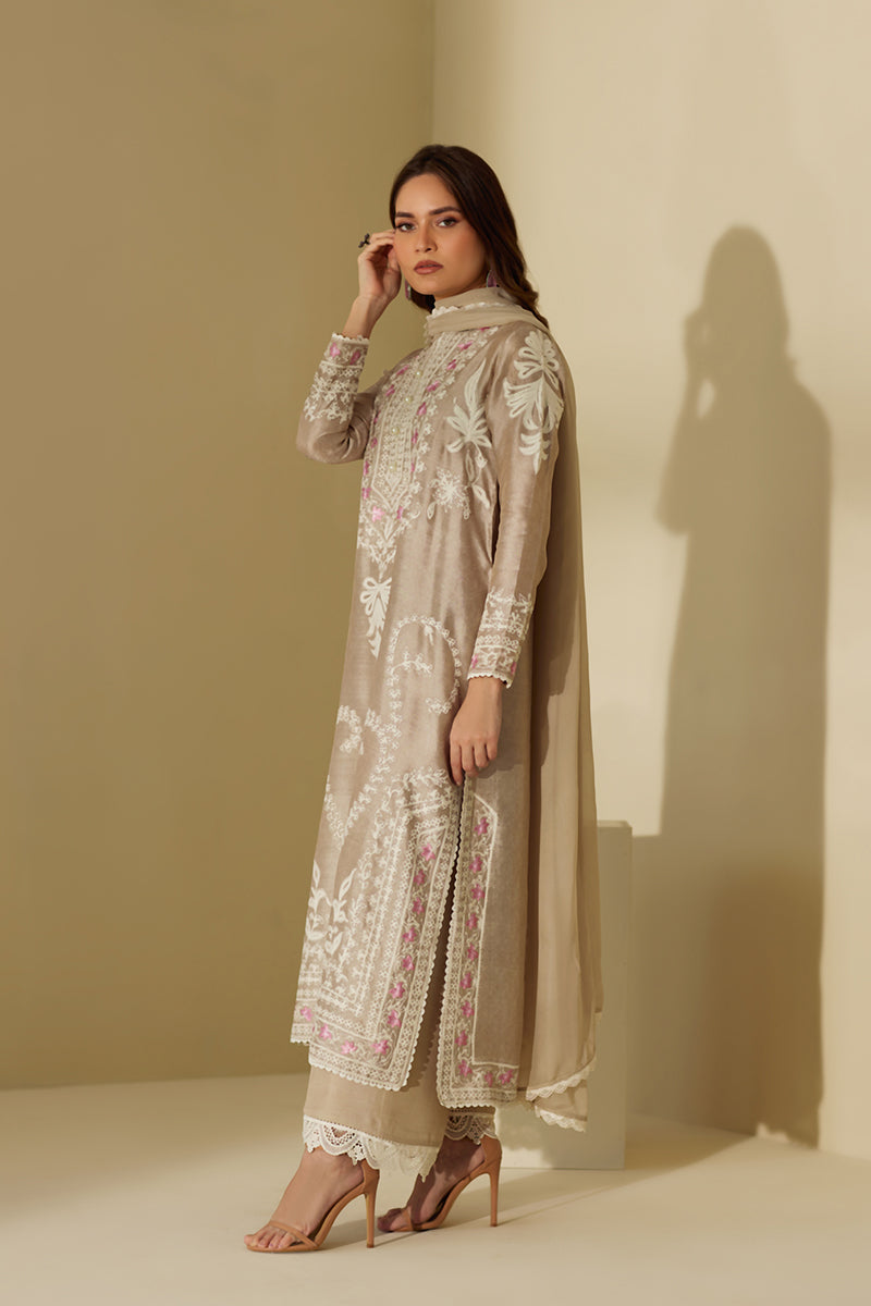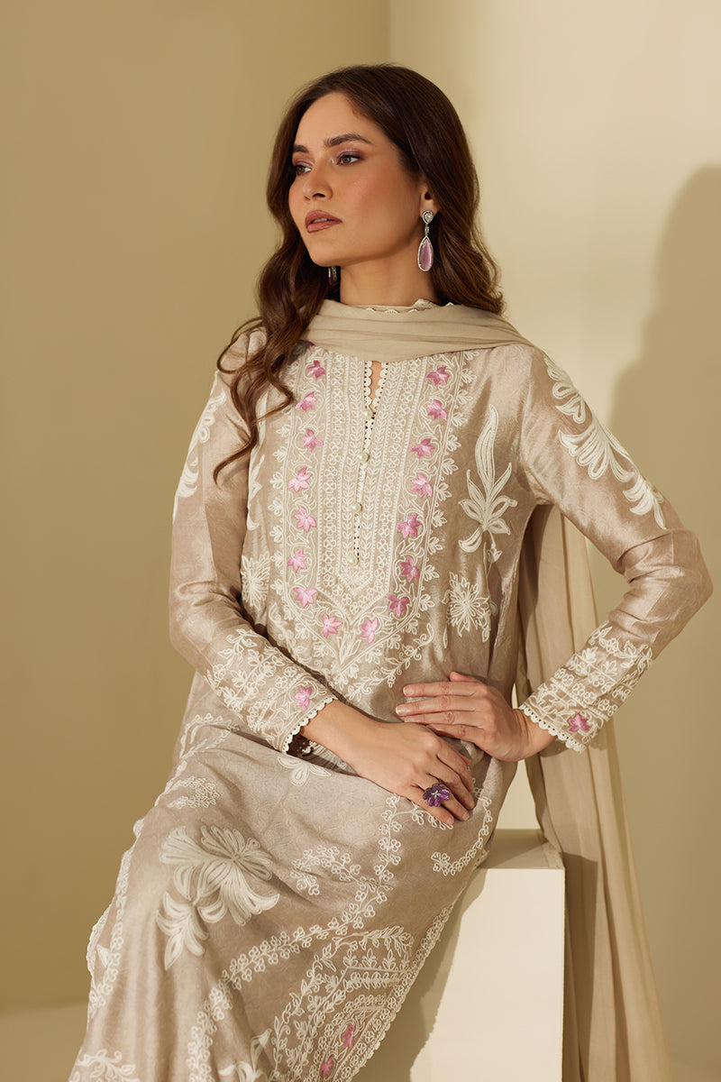 Look graceful as ever in this long straight shirt that features delicate floral theadwork throughout the shirt with light hues on the neckline. The outfit is competed with ezaar pant and a matching chiffon dupatta.