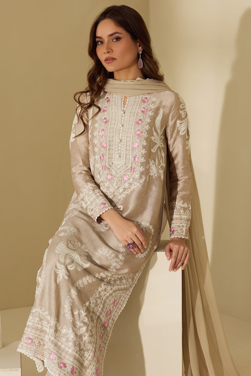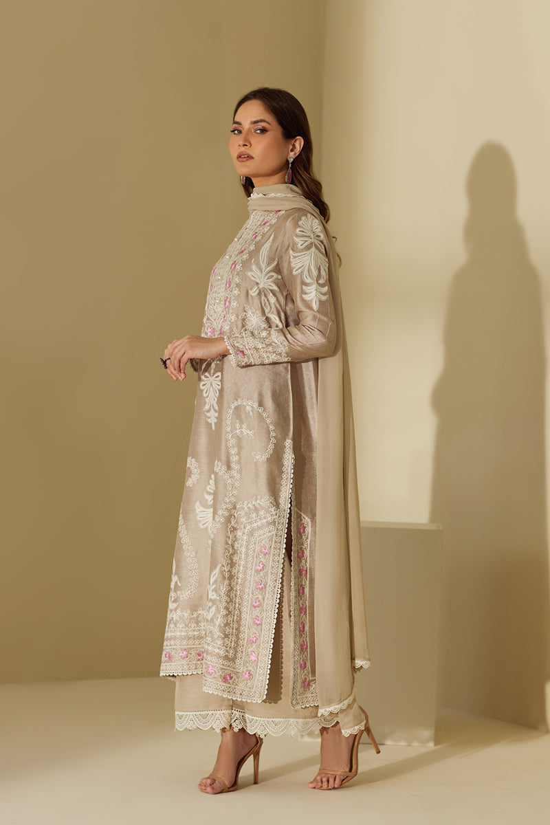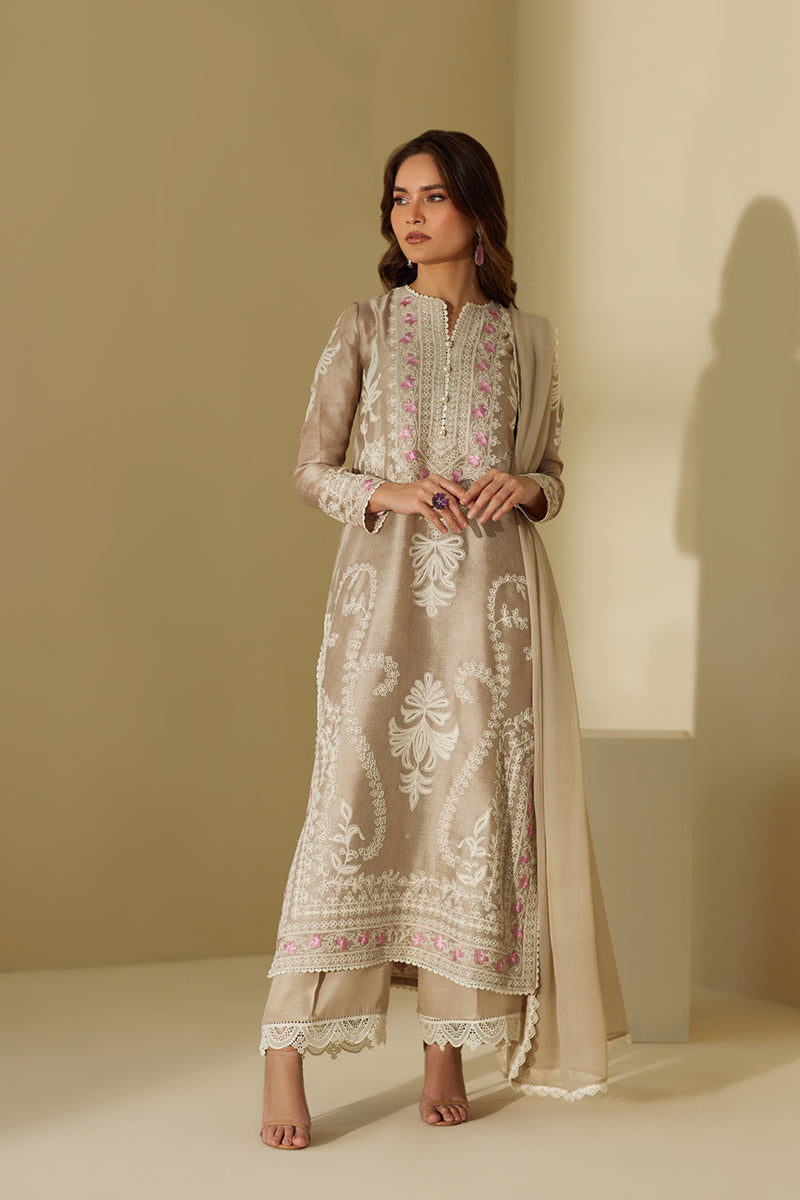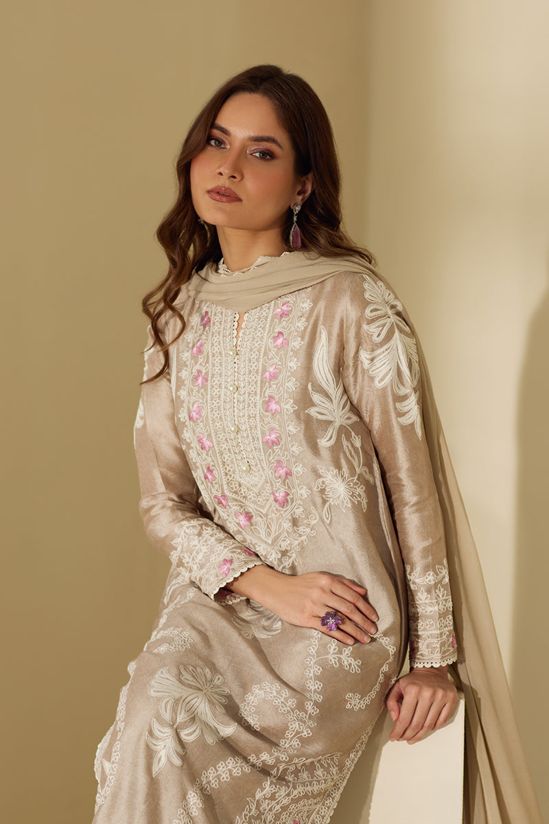 Look graceful as ever in this long straight shirt that features delicate floral theadwork throughout the shirt with light hues on the neckline. The outfit is competed with ezaar pant and a matching chiffon dupatta.