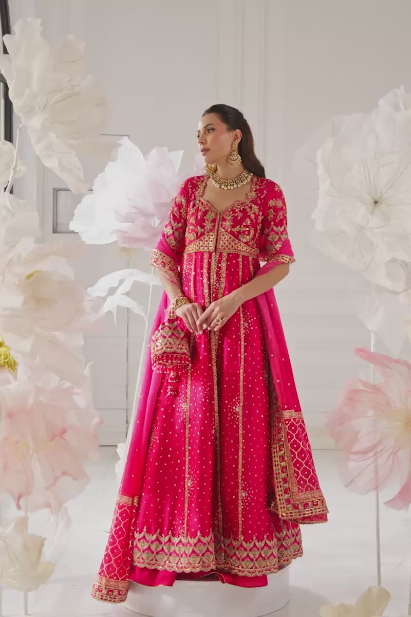 This dazzling, hot-pink kalidar from Mina Hasan's Dholki Collection is a vision of traditional celebration and vibrant color. The voluminous pishwas silhouette is richly adorned with delicate gold tilla and shimmering crystal work, creating an all-over sparkle that is perfect for a pre-wedding function. The ensemble is completed with a deep-pink dupatta and matching potli bag, making it an utterly glamorous choice for a festive night.