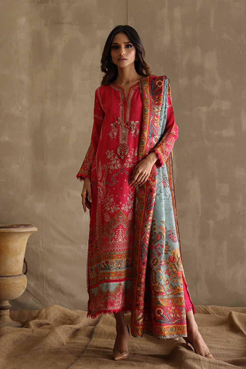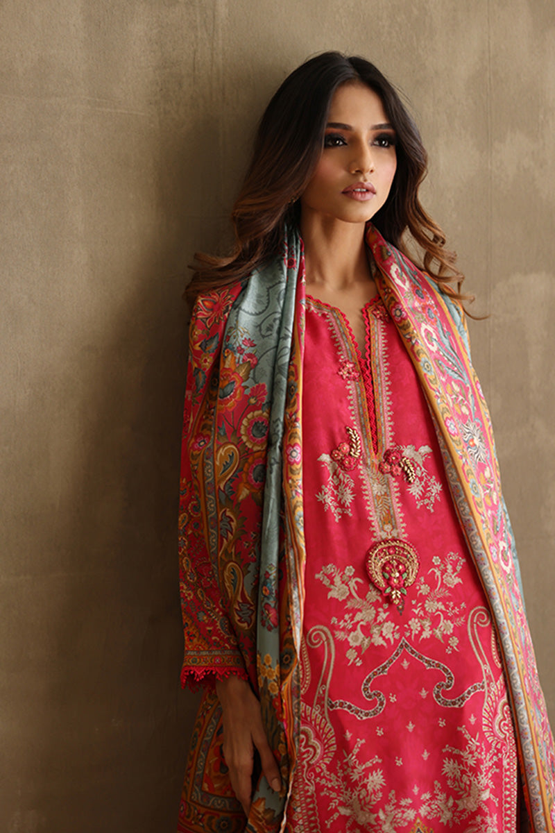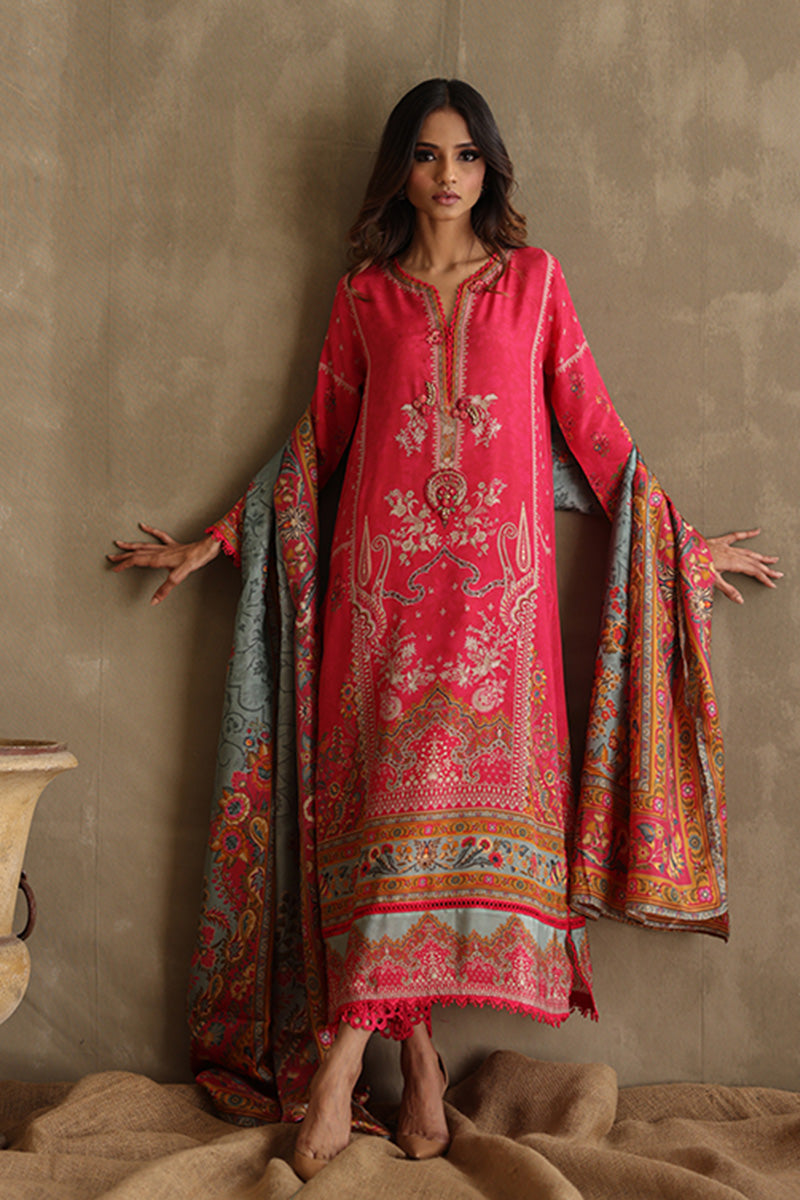 Our classic Mina Hasan digital kurtas come back in a straight long silhouette and striking bold colors! Choose this fuchsia option for effortless elegance! Comes with hand worked button details and feminine lace edgings